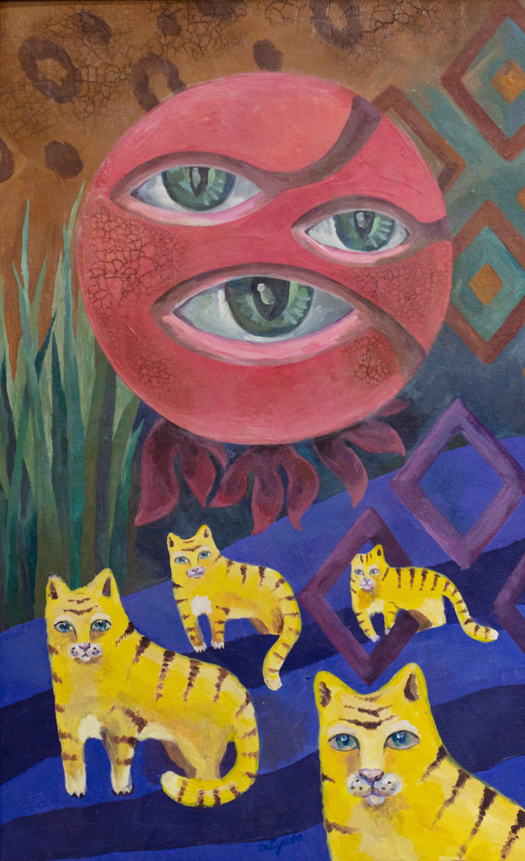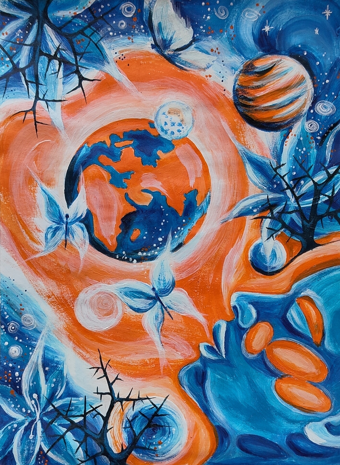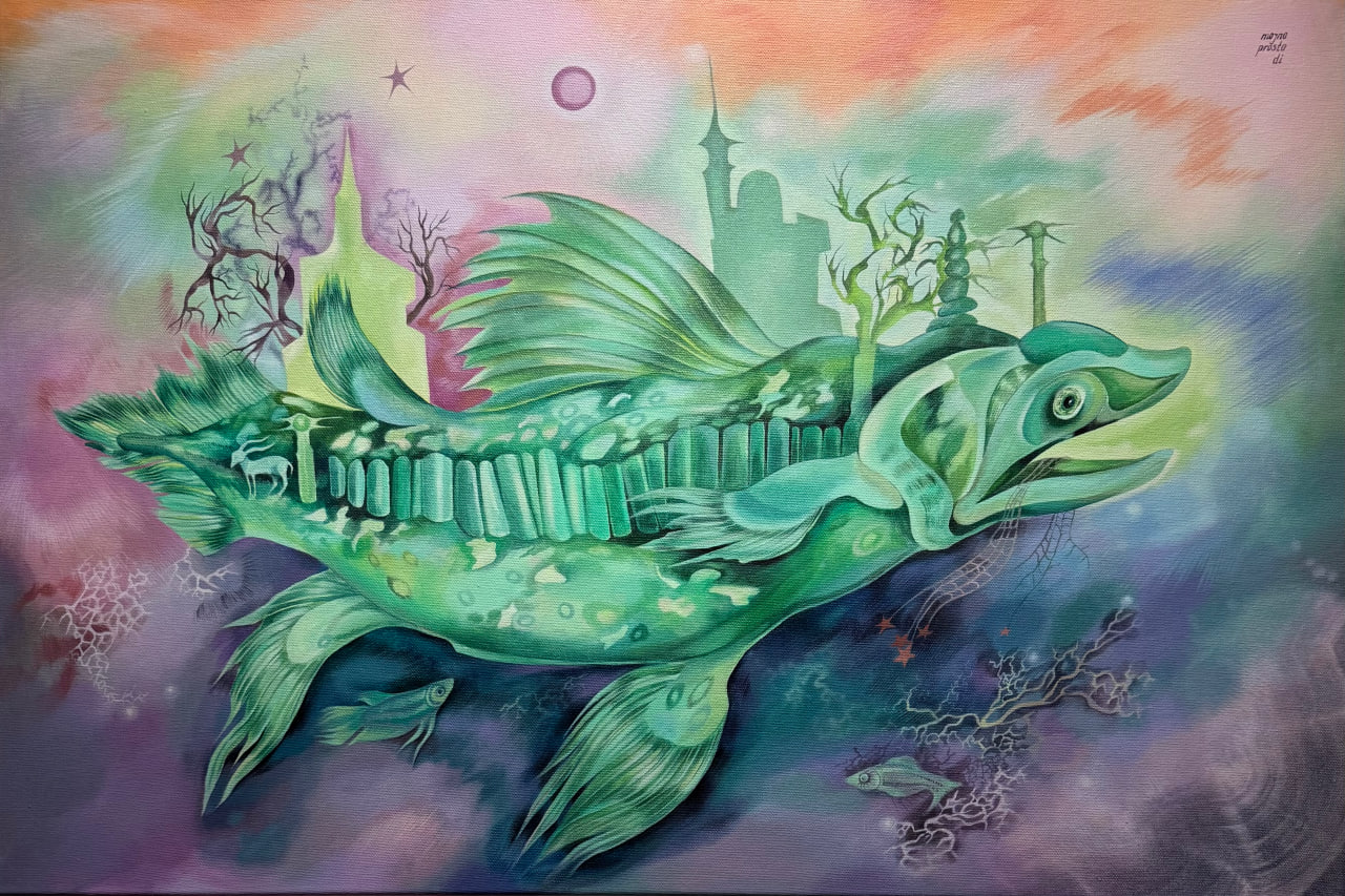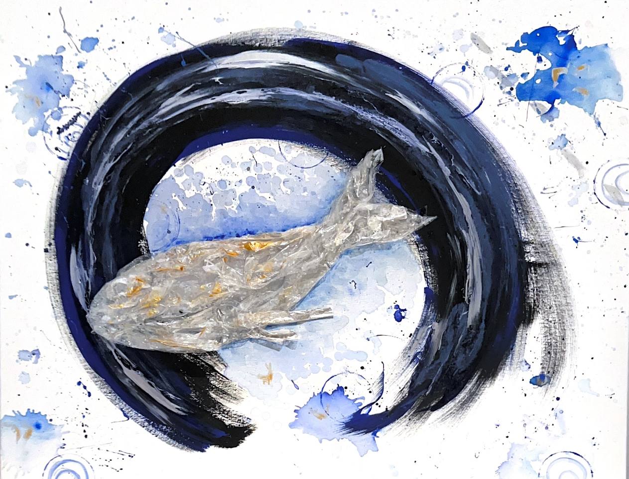 Работа Екатерины Серомахи исследует северного кита как биологический и метафизический феномен, существующего одновременно в нескольких временных плоскостях. В логике Книги Перемен она символизирует единство природы, науки и духовного осознания, где концентрические круги-волны отражают цикличность жизни и взаимосвязь всех элементов системы. Прозрачное тело кита из переработанного пластика превращает загрязнение в художественное выражение, напоминая о возможности алхимического преобразования. Картина предостерегает и вдохновляет: осознанное взаимодействие человека с миром несёт гармонию и новую ответственность за планету.