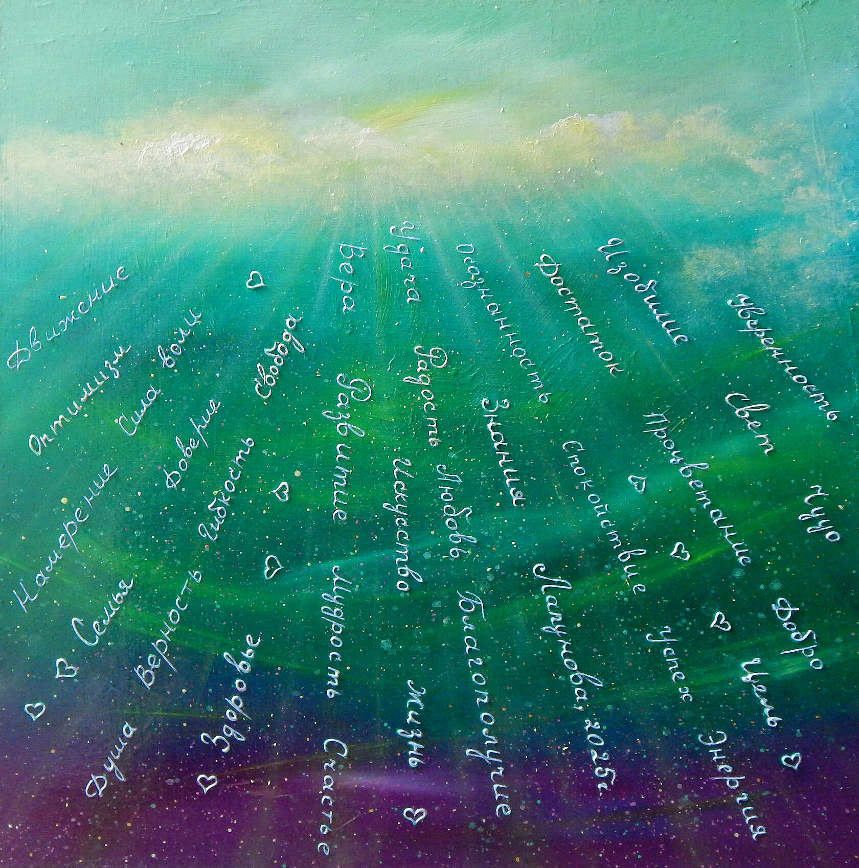 Работа Ольги Лапуновой отражает силу мысли и намерения, способных преобразовывать события и материю. Она показывает, что человек влияет на энергоинформационное пространство вокруг себя и притягивает то, о чём думает или чего боится. В логике Книги Перемен работа символизирует поток взаимодействия между внутренним миром человека и внешней реальностью, где каждое намерение рождает последствия. Она напоминает, что осознанные мысли и действия создают процесс материализации, а правильное направление усилий приносит гармонию, успех и радость.