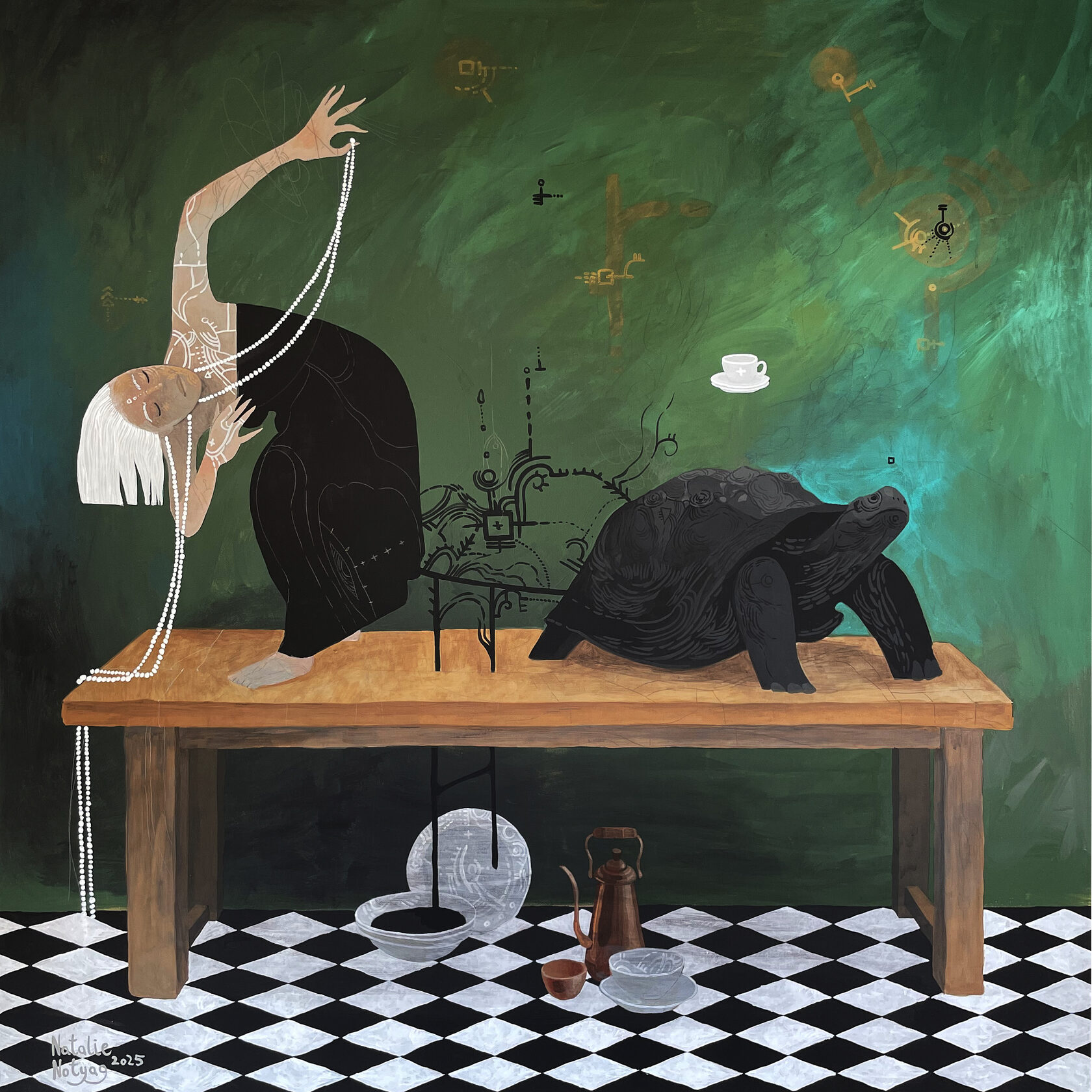 Работа Джулии Русаковой изображает творца вне пространства и времени, где всё рождается из ничего и возвращается в пустоту. В логике Книги Перемен она символизирует цикл создания и разрушения, в котором мельчайшие частицы формируют будущее. Картина напоминает, что каждое мгновение зарождает новые формы и возможности, открывая путь к осознанному творению и преобразованию мира.
