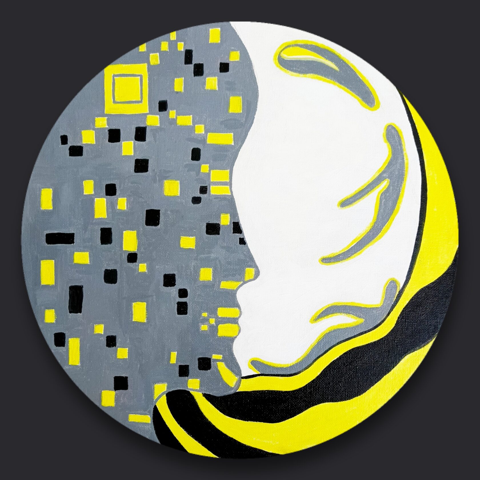 Работа Alexa Melowany показывает время, когда цифровизация проникла во все сферы жизни: смартфоны, штрихкоды, пиксели формируют облик человека. В профиле можно увидеть дом с окнами, где в некоторых свет - символ присутствия человеческого и внутреннего мира среди технологического потока. В логике Книги Перемен работа предвещает будущее, где технологии становятся неотъемлемой частью жизни, а их влияние зависит от осознанного использования. Она напоминает, что развитие цифрового мира должно служить благу человечества, а не разрушению, и что прогресс несёт и возможности, и ответственность.