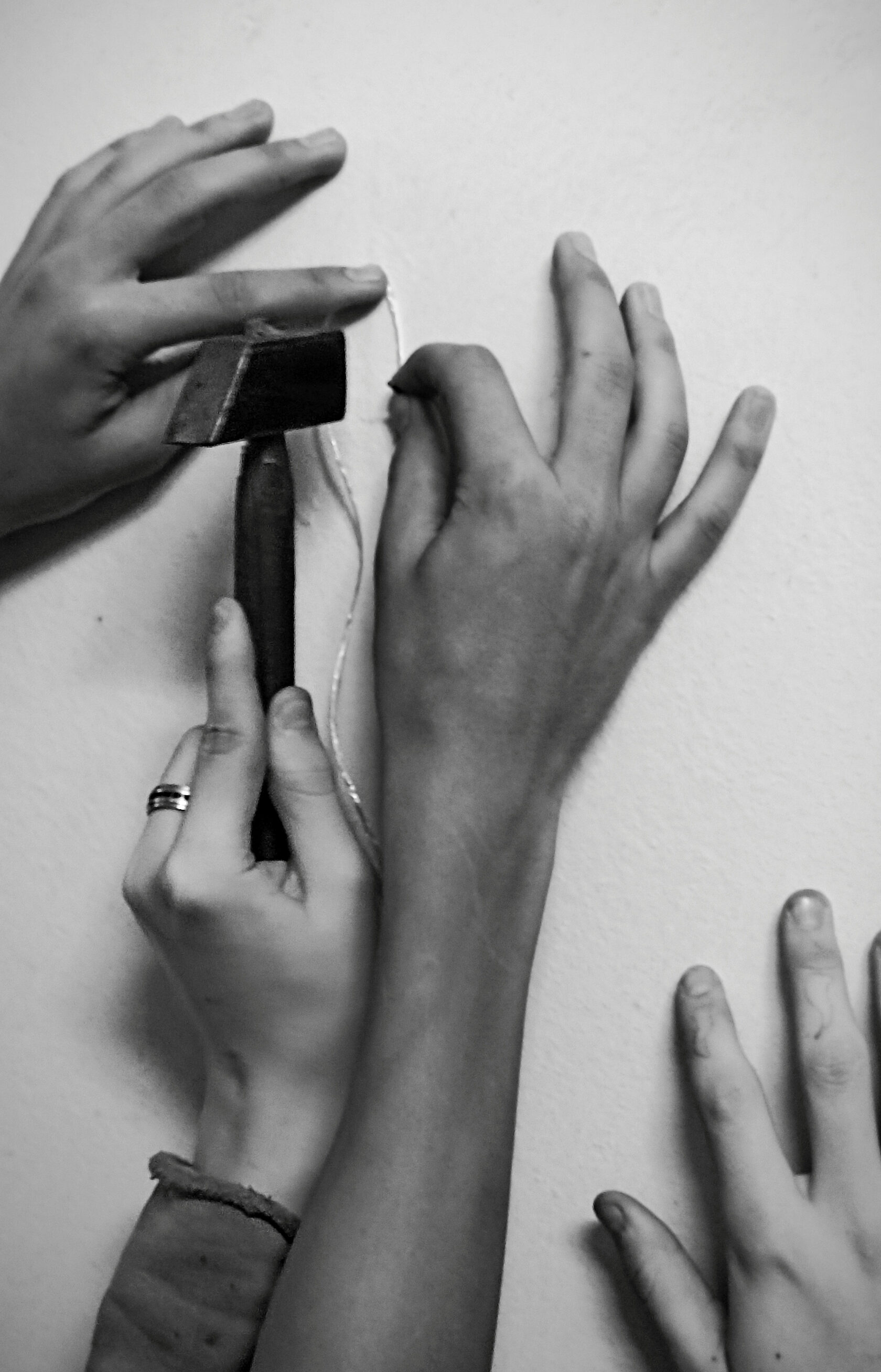 Фотография Михаила Доманова фиксирует момент коллективного действия - руки молодых людей в процессе создания выставки. Архаичный жест измерения верёвкой и забивание гвоздя становятся знаком соединения прошлого опыта и настоящего усилия. В логике перемен эта сцена указывает на нарастающее движение и предвещает усиление совместной выставочной активности.