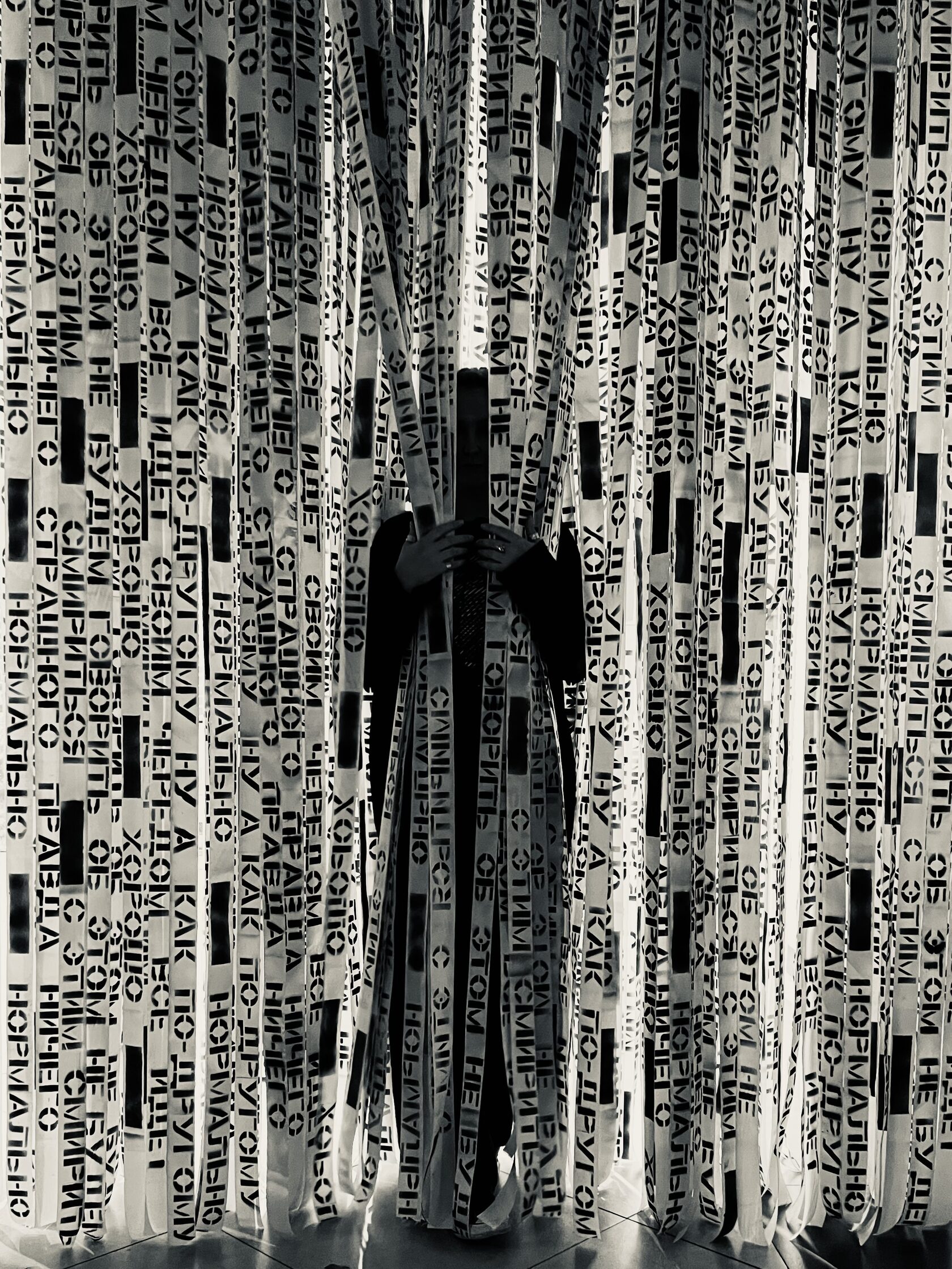 Работа Елены Тормышевой прочитывается как критический знак давления нормативного счастья. Конформистские формулы, нанесённые на ленты и частично скрытые, указывают на подмену индивидуального опыта коллективными сценариями «нормальности». В логике перемен эта работа говорит о размывании истины и необходимости различать навязанный нарратив и собственное переживание.
